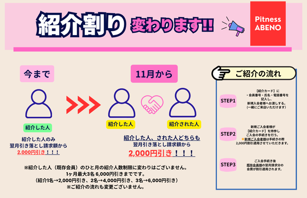 • 紹介割:紹介者&入会者ともに1月会費2,000円OFF
