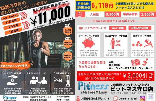 期間中にご入会していただくと、入会金・事務手数料11・12・1月会費まとめて¥11,000