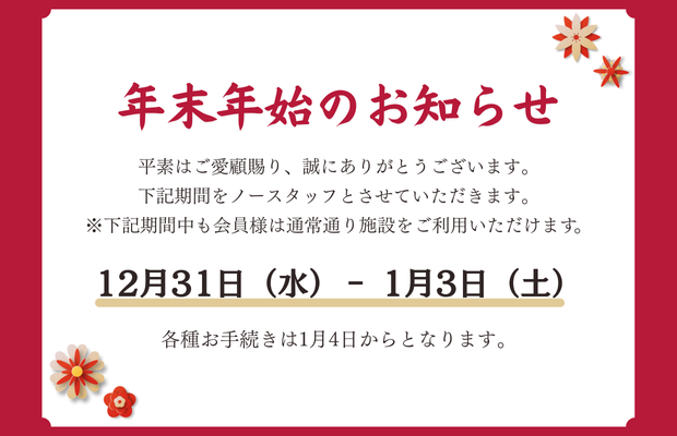 ジム自体は年末年始も通常通り、24時間ご利用可能となっておりますので、年納め、年初めのトレーニングにぜひご来館ください。